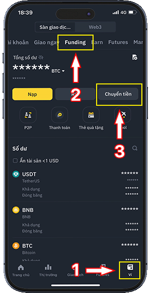 • 1、Đăng nhập ứng dụng Binance, Chọn chức năng Ví (1), sau đó chọn ví Funding (2) và ấn Chuyển tiền (3)