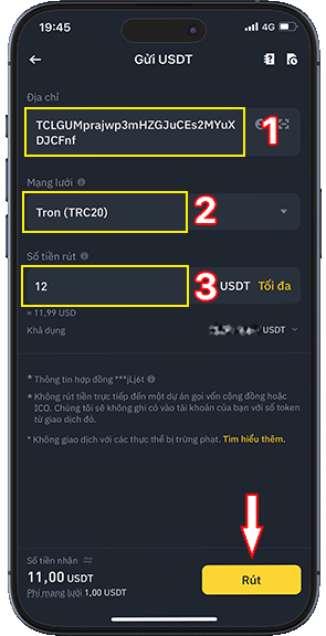 • 10、Quay lại trở ứng dụng Binace, dán địa chỉ vừa sao chép vào ô địa chỉ. Chọn mạng lưới tương ứng (ERC20 hoặc TRC20). Nhập số lượng USDT cần nạp vào tài khoản và ấn Rút.
