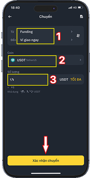 • 2、Kiểm tra thông tin chuyển từ ví Funding đến ví giao ngay (1). Chọn tiền USDT (2). Nhập số lượng USDT cần nạp (3) và ấn Xác nhận chuyển.