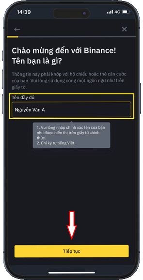 • 10、Nhập tên đầy đủ đúng với chứng minh thư hoặc cccd và ấn tiếp tục.