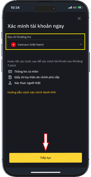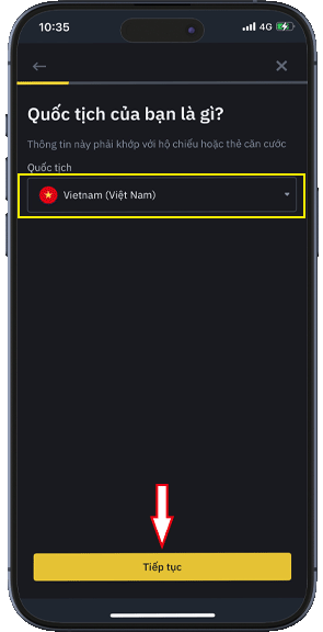 • 11、Chọn quốc tịch và ấn tiếp tục.