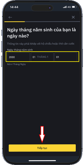 • 12、Nhập ngày tháng năm sinh đúng với chứng minh thư hoặc cccd và ấn tiếp tục.