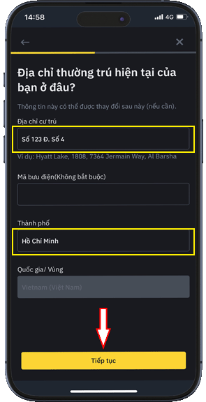 • 14、Kiểm tra thông tin thường trú, điền thành phố và ấn tiếp tục.