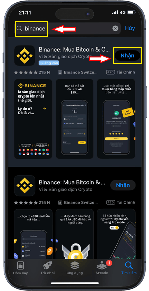 • 2、Nhập vào ô tìm kiếm từ khoá Binance. Sau đó bấm nhận để tải ứng dụng.