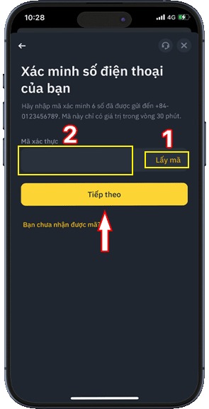• 6、Ấn lấy mã (1), Nhập mã xác thực từ tin nhắn gửi về (2), sau đó ấn tiếp theo.