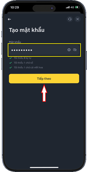 • 7、Nhập tạo mật khẩu phù hợp với yêu cầu sao cho 3 dấu tích xanh xuất hiện sau đó ấn tiếp theo.