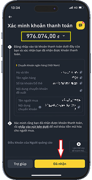 • 13、Màn hình xác minh thanh toán xuất hiện, kiểm tra số dư tài khoản ngân hàng , nếu đã nhận được khoản thanh toán đúng số tiền và nội dung hiển thị thì ấn vào nút Đã nhận.
