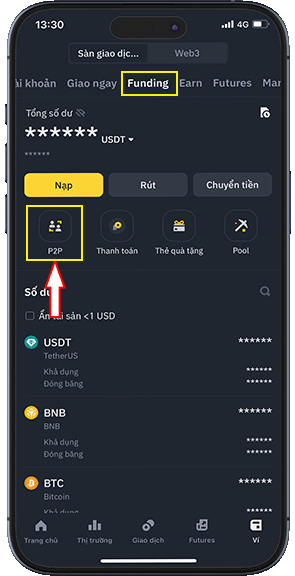 • 1、Vào ứng dụng Binance, chọn chức năng Ví (1), chọn ví Funding (2), sau đó chọn P2P (3)