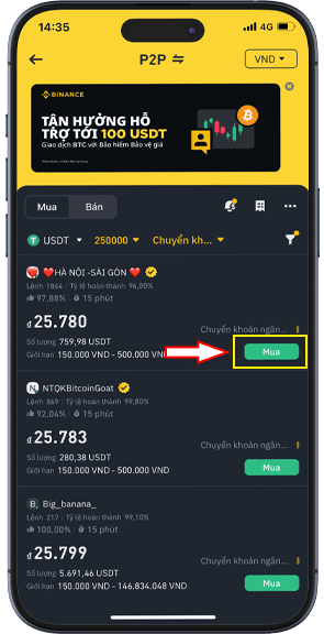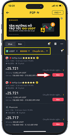 • 6、Lọc bớt thông tin, chọn đồng USDT, nhập số tiền VND tương đối với số USDT cần rút, và lọc hình thức thanh toán (chuyển khoản). Sau đó chọn 1 người mua phía dưới và ấn bán.