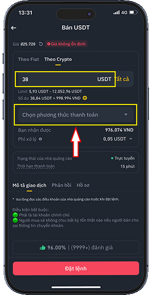 • 7、Nhập số lượng USDT cần bán, sau đó bấm vào phương thức thanh toán để tạo, nếu đã có chuyển qua bước 11.