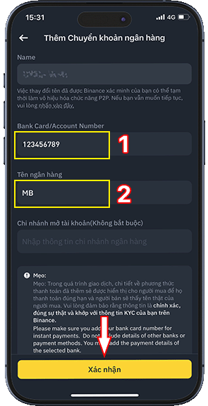 • 9、Nhập số tài khoản ngân hàng vào ô Bank Card (1), nhập tên ngân hàng (2) và kiểm tra lại thông tin bao gồm tên người thụ hưởng ở ô Name, nếu đã đúng ấn Xác nhận.