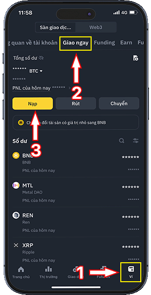 • 1、Đăng nhập vào ứng dụng Binance, chọn chức năng Ví (1), chọn ví Giao ngay (2) và ấn nạp (3).