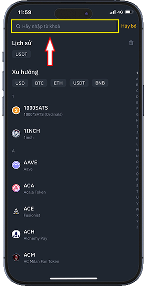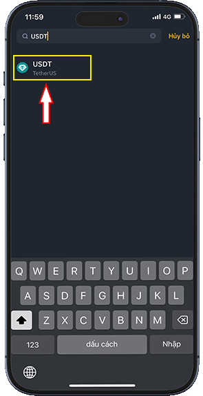 • 5、Chọn đồng tiền USDT ở danh sách coin.