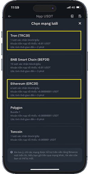 • 4、Chọn mạng lưới TRC20 hoặc ERC20.