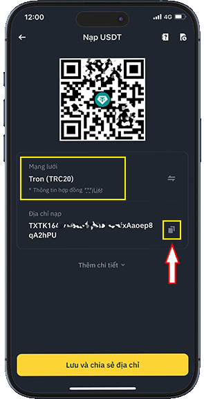 • 5、Màn hình hiển thị địa chỉ nạp tương ứng với mạng lưới đã chọn. Ấn copy địa chỉ.
