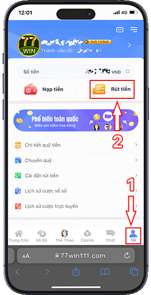 • 6、Vào trình duyệt đăng nhập vào trang 123B, tiếp theo chọn menu Tôi (1) và chọn rút tiền (2).
