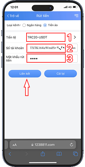 • 8、Ô Tiền tệ chọn đúng với mạng lưới đã chọn bên Binance (1), sau đó dán địa chỉ đã copy vào ô Số tài khoản (2), tiếp theo tạo mật khẩu rút tiền (3). Xong ấn Liên kết.