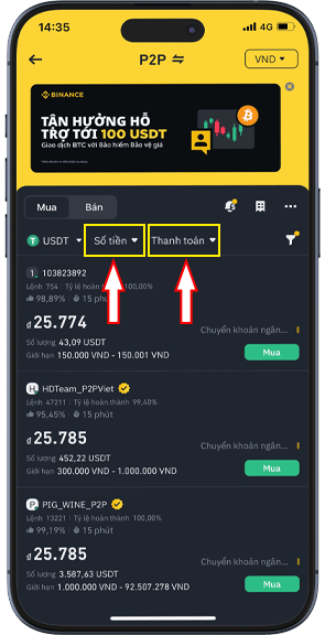 • 2、Lọc người bán bằng cách nhập tương đối số lượng tiền VND cần chuyển qua USDT, sau đó tiếp tục chọn cách thức thanh toán, ví dụ chuyển khoản.
