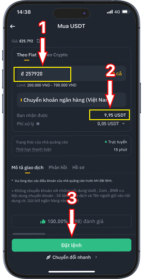 • 4、Theo Fiat. Nhập số tiền VND để đổi qua USDT (1), sau đó kiểm tra số USDT nhận được sau khi đổi (2) và ấn Đặt lệnh (3)