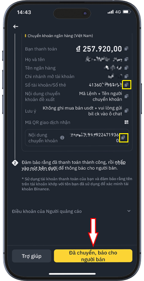 • 6、Vào app ngân hàng chuyển khoản cho người bán đúng thông tin hiển thị. Lưu ý nội dung chuyển khoản copy và dán đúng với mô tả. Chuyển xong chụp lại bill và ấn nút đã chuyển.